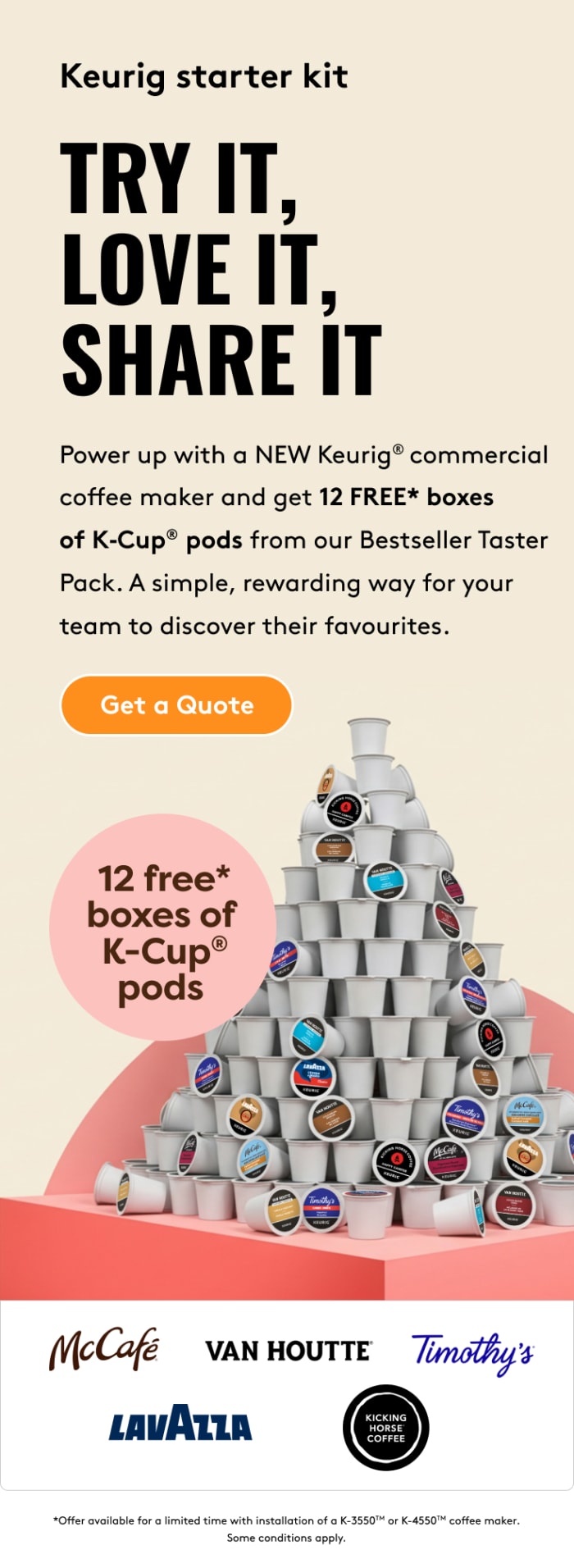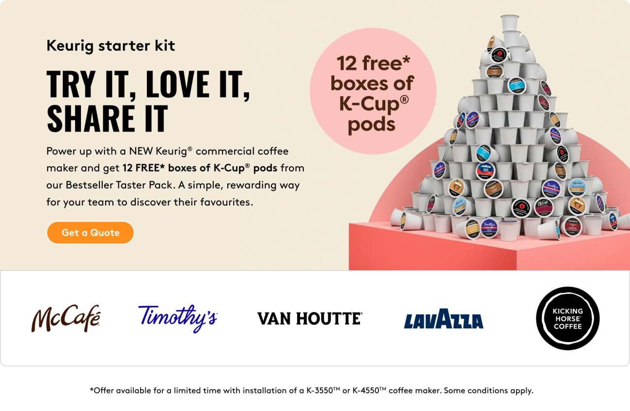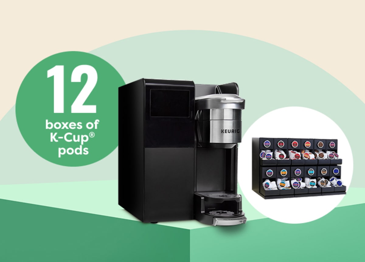 Get 12 boxes of K-Cup® pods + an 12-ct Keurig merchandiser + milk powder with the installation of a K-4550TM.